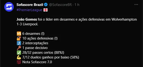 Neste sábado (16), inclusive, o camisa 8 foi titular diante do poderoso Liverpool, de Mohamed Salah. Os Wolves até começaram bem a partida e foram para o intervalo vencendo por 1 a 0, mas sofreram a virada na etapa final. Agora, em cinco partidas disputadas, o Clube aparece com apenas uma vitória e quatro derrotas, mas João Gomes vem sendo um destaque absoluto.