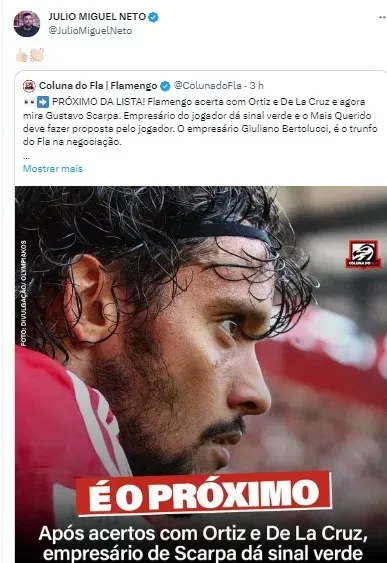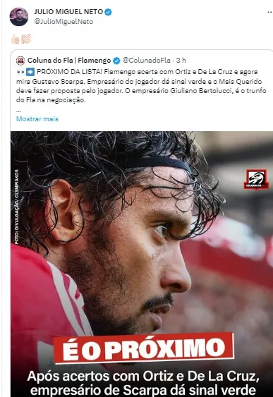Segundo informado pelo jornalista Júlio Miguel Neto, o empresário de Scarpa, Giuliano Bertolucci tem uma boa relação com a diretoria flamenguista e ele deu sinal verde para Landim e cia fazer uma boa proposta.