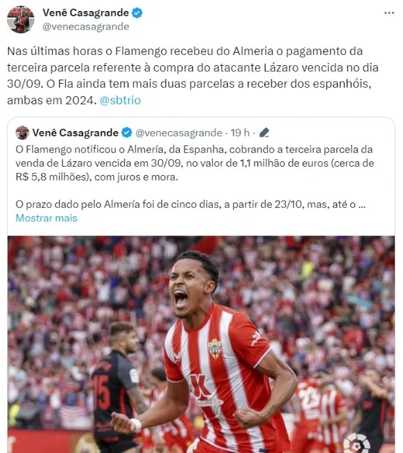 “Nas últimas horas o Flamengo recebeu do Almeria o pagamento da terceira parcela referente à compra do atacante Lázaro vencida no dia 30/09. O Fla ainda tem mais duas parcelas a receber dos espanhóis, ambas em 2024”, escreveu Venê.