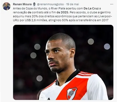 “Torcedores do Fla estão especulando sobre De La Cruz como possível reforço do Flamengo para 2024. Importante lembrar que o vínculo do uruguaio com o River Plate se encerra apenas em dezembro de 2025. Diante desse cenário, imaginar que o Flamengo esperaria pelo fim do contrato para contratá-lo é meio maluco”, relatou Nicola.