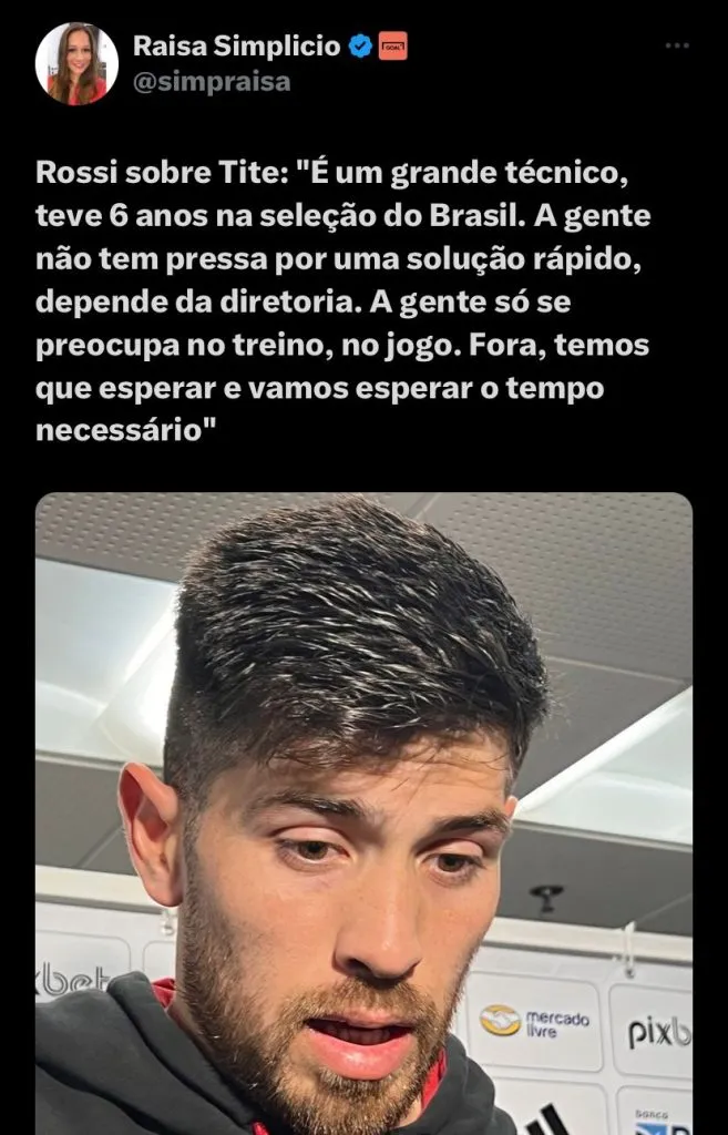 Em entrevista ao GE e para outros veículos de informação ainda no Maracanã, o goleiro Rossi falou sobre a possibilidade da chegada de Tite: “Eu acho que é um grande técnico. Foram seis anos na Seleção Brasileira. Ele é muito importante para o país. A gente não tem pressa de uma solução rápida, isso depende da diretoria. Só pensamos em treinar, jogar e fazer o melhor dia a dia. Temos um jogo importante contra o Corinthians na semana que vem e temos que ganhar. A gente só se preocupa com o dia a dia, treino e jogo. O que não depende de nós, temos que esperar o tempo necessário”, disse.