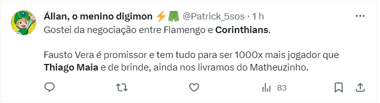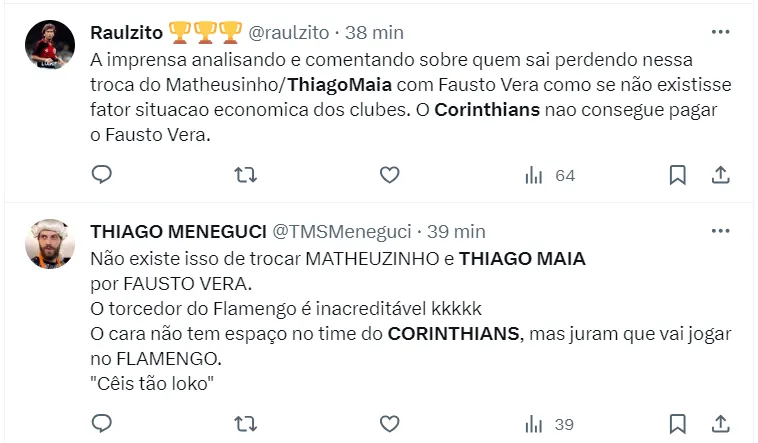 Entretanto, nenhuma proposta oficial ou qualquer um dos clubes confirmou essa negociação. Mas, o meio-campista já se antecipou e descartou a possibilidade de trocar o Rio de Janeiro por São Paulo. Thiago Maia quer permanecer no Flamengo em 2024.