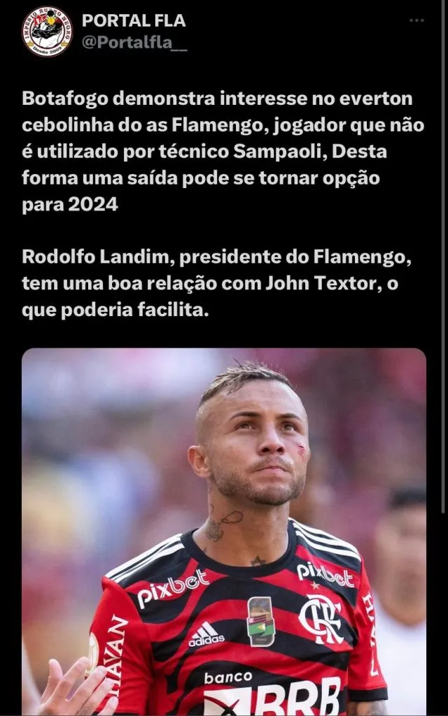 Lembrando que o Everton Cebolinha perdeu totalmente o espaço com Jorge Samapoli, atualmente ele não vem sendo utilizado da forma que deveria pelo argentino, porém, ele ainda tem contrato até junho 2026 e custou aos cofres flamenguistas R$ 14 milhões de euros.