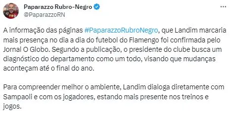 Landim quer entender o que está acontecendo nos bastidores do Ninho e, para tanto, abriu um franco e direto diálogo com Sampaoli e os próprios jogadores. Tal medida consiste em estar com mais assiduidade nos treinamentos e nas partidas do Fla. Ainda de acordo com o Paparazzo, o ambiente entre o técnico e o grupo ainda não está totalmente sanado das rusgas e o presidente avalia se trocará o comando ou se trocará os jogadores, em uma reformulação.