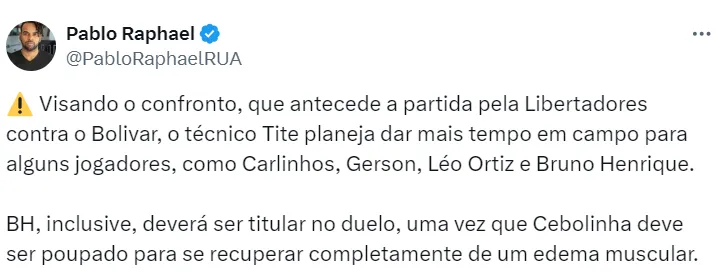 No entanto, uma notícia tem deixado os torcedores do Flamengo bem animados para o confronto. Isso porque o Bolívar, que tem o brasileiro Bruno Sávio no elenco, chegará em baixa para a partida.