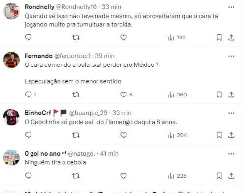 “Em contato com #MarcioCruz, empresário de #EvertonCebolinha, o agente falou sobre rumores ou uma possível saída do #Flamengo“, escreveu Julio Miguel no X, antigo Twitter – veja a publicação completa abaixo.