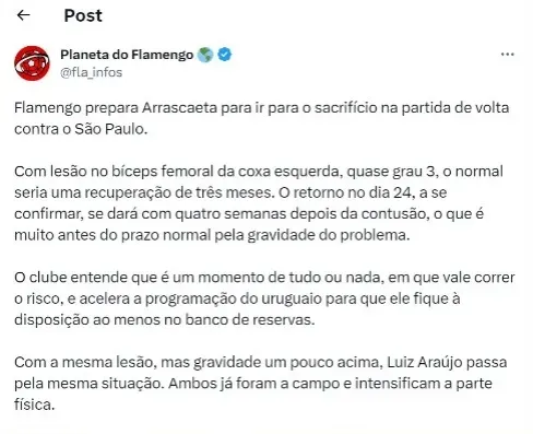 A missão do Flamengo é fazer o meia uruguaio jogar no Morumbi no próximo domingo (24). Em informação d’O Globo, o Clube está agilizando o retorno de Arrascaeta e atualmente se encontra disposta a colocar o atleta em campo no sacrifício, se necessário. Apesar do grau 3 na lesão do bíceps femoral, o que duraria normalmente três meses para a recuperação total, o craque pode retornar com apenas quatro semanas. E os reforços não parariam por aí.