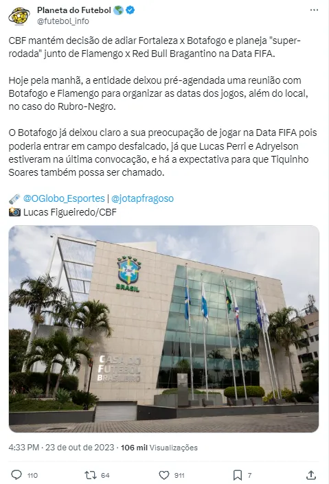 Com a informação de que a CBF estaria planejando uma “super-rodada” com Flamengo x Red Bull Bragantino e Fortaleza x Botafogo, as reclamações começaram a pipocar. A Confederação deixou pré-agendada nesta segunda-feira (23) uma reunião junto de Botafogo e Flamengo para definir o calendário das partidas, que devem acontecer entre a 3ª e a 4ª semana de novembro. O caso do Rubro-Negro seria além disso, já que o local do duelo também deve ser discutido. Na visão de alguns botafoguenses, o Alvinegro está sendo prejudicado.