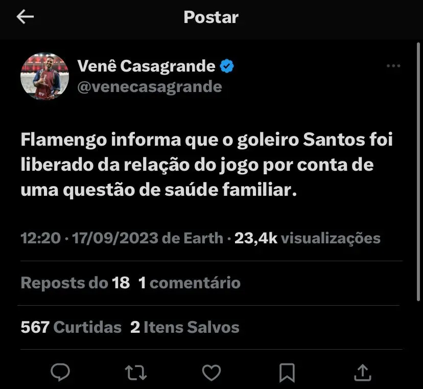 Para além disso, Venê Casagrande trouxe de última hora um desfalque no banco de reservas do Flamengo, talvez não seja uma dor de cabeça para Sampaoli, mas o goleiro Santos. Segundo informado, ele foi liberado pelo Rubro-Negro para acompanahr uma questão de saúde na familia.