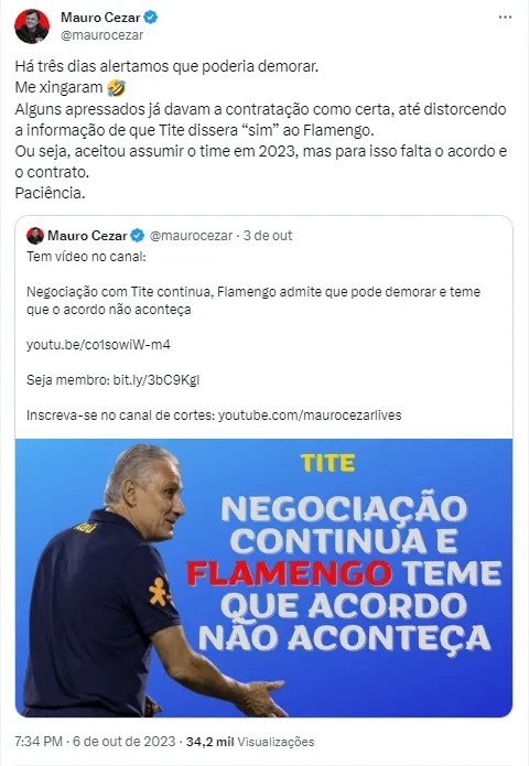 Por meio do Twitter, o comentarista lembrou que o treinador ainda não está acordado de forma completa com o Flamengo e muito menos possui contratado assinado. Mauro ressalta que algumas pessoas quiseram cravar o acerto antes da hora, como se Tite já tivesse dado o “sim” para Landim e companhia. Mas o que o jornalista pede, sobretudo, é paciência para que o caso possa ser concretizado em breve.