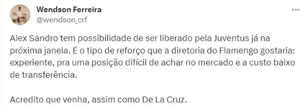 Pela estrutura e principalmente pelo Tite. O lateral gosta muito do trabalho da atual comissão técnica do Fla. A Juventus está disposta a liberar o jogador em janeiro, mesmo tendo contrato até junho.