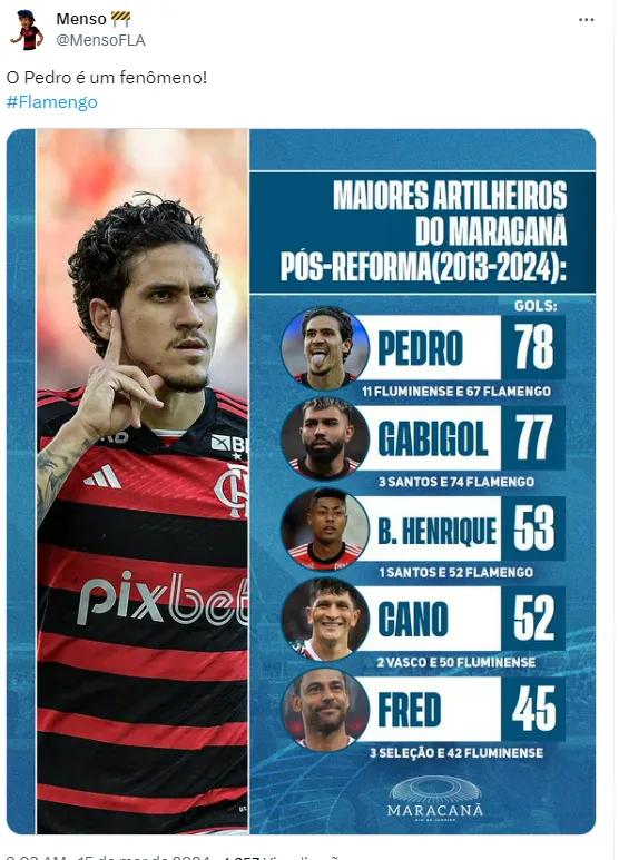 No último sábado (9), o atacante se isolou no posto de maior artilheiro do novo Maracanã. Ou seja, depois da reforma de 2013, Pedro é o maior goleador, com 78 gols já marcados na casa do Flamengo.