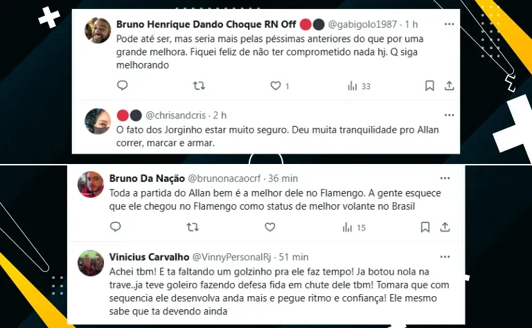 Para finalizar, no Rubro-Negro desde 2023, Allan ainda não conseguiu apresentar um futebol perto daquele visto no Atlético-MG. Ontem (12), porém, pode ter sido o início de uma nova era. Veja alguns comentários: