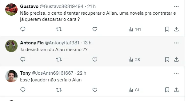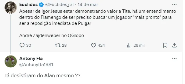 Nas redes sociais, os flamenguistas repercutiram a situação do meio-campista depois de receber uma informação. De acordo com apuração de André Zajdenweber, do site O Globo, o Fla pretende buscar um volante nas duas próximas janelas: a de abril ou na do meio ano, para suprir a saída de Thiago Maia.
