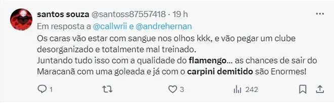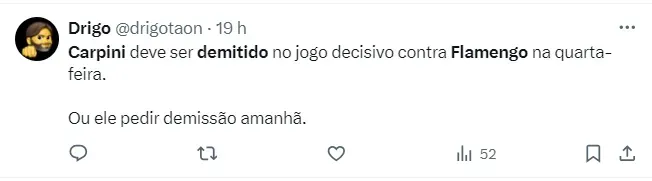 A análise é que uma derrota para o Flamengo nesta quarta pode por fim a era do treinador no SPFC. Sendo assim, o Mengo pode ser o responsável final pela demissão de Carpini.