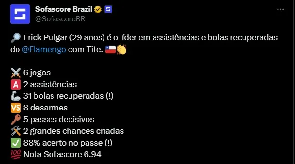 Pulgar tem se destacado na criação de jogadas, proporcionando liberdade aos colegas de equipe para marcar gols. Esteve presente em momentos cruciais, como nas assistências para Pedro diante do Palmeiras e para Arraescaeta contra o Fluminense. Duas assistências, ambos resultando em gols. Vale a pena conferir os números do jogador sob a direção de Tite e sua contribuição para o time flamenguista.