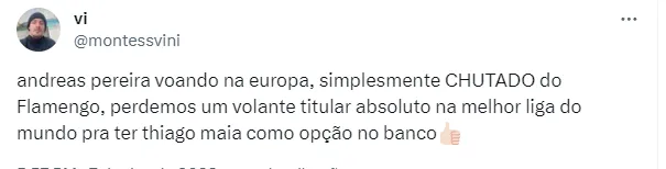 “Andreas Pereira voando na Europa, simplesmente chutado do Flamengo, perdemos um volante titular absoluto na melhor liga do mundo pra ter Thiago Maia como opção no banco”, comentou um torcedor do Mengão.