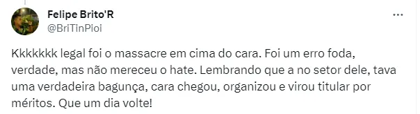 “Legal foi o massacre em cima do cara. Foi um erro foda, verdade, mas não mereceu o hate. Lembrando que a no setor dele, estava uma verdadeira bagunça, cara chegou, organizou e virou titular por méritos. Que um dia volte!”, destacou outro flamenguista.