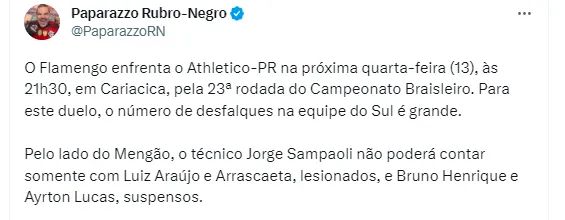 Antes de iniciar a jornada na grande decisão da Copa do Brasil, contra o São Paulo, o Flamengo tem o compromisso já citado, contra o Athletico-PR. A partida está marcada para acontecer na próxima quarta-feira (13), às 21h30 (horário de Brasília), no Estádio Kléber Andrade, no Espírito Santo.