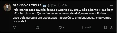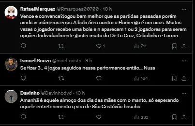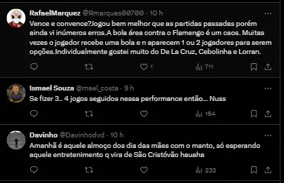 “O resultado do desempenho e o resultado do jogo foi compatível. Foram associados. As oportunidades que tivemos e o volume que criamos. O número de participações do goleiro adversário. A precisão das finalizações. Isso trouxe a vitória consistente”, analisou Tite, destacando o volume de jogo da sua equipe no confronto.