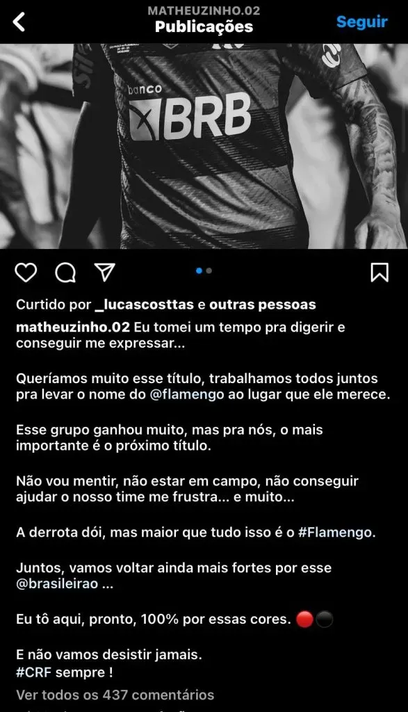 Diante do título perdido, aos poucos, os jogadores flamenguistas ‘botam a cara’, dessa vez, foi o lateral-direito Matheusinho, que inclusive não estava presente no jogo para falar sobre a derrota. Em um post no Instagram, o jogador lamentou não poder ter ajudado o time flamenguista contra o São Paulo, afirmando que o grupo queria muito esse título.