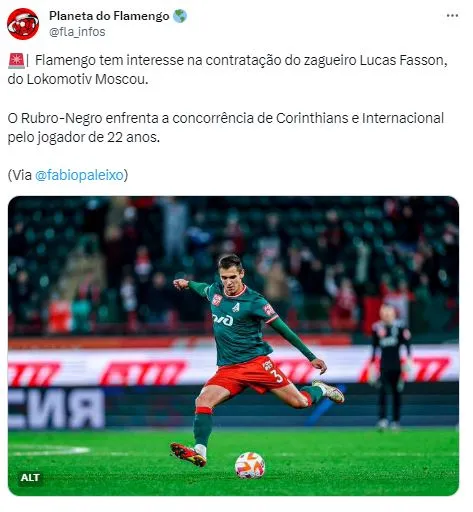 Trata-se do zagueiro Lucas Fasson, atualmente no Lokomotiv, da Rússia, desde 2022, quando foi vendido pelo Athletico-PR por 3 milhões de euros (R$ 16 milhões). A informação é do jornalista Fábio Aleixo e também reverberou na Coluna do Fla.