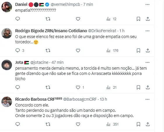“Nós queremos contar com todo mundo (contra o Palmeiras). O objetivo é a classificação direta para a Libertadores. Esse é o objetivo traçado e o objetivo passado pela diretoria a mim. Esse é um pedido que faço para o torcedor. Torcedor, tudo que a gente quer é dividir alegria, mas que entenda que precisará ajudar, pois o time vai oscilar”, pediu.