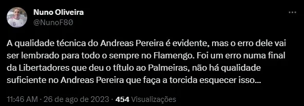 “A qualidade técnica do Andreas Pereira é evidente, mas o erro dele vai ser lembrado para todo o sempre no Flamengo. Foi um erro numa final da Libertadores que deu o título ao Palmeiras, não há qualidade suficiente no Andreas Pereira que faça a torcida esquecer isso…”;