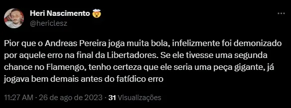 “Pior que o Andreas Pereira joga muita bola, infelizmente foi demonizado por aquele erro na final da Libertadores. Se ele tivesse uma segunda chance no Flamengo, tenho certeza que ele seria uma peça gigante, já jogava bem demais antes do fatídico erro”