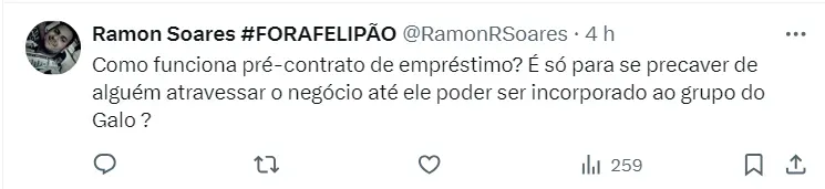 Conforme informações do portal Fala, Galo, a equipe mineira só tem o interesse em negociá-lo através de empréstimo. Além de recentemente ter renovado o contrato com o atleta, que vai até dezembro de 2025.