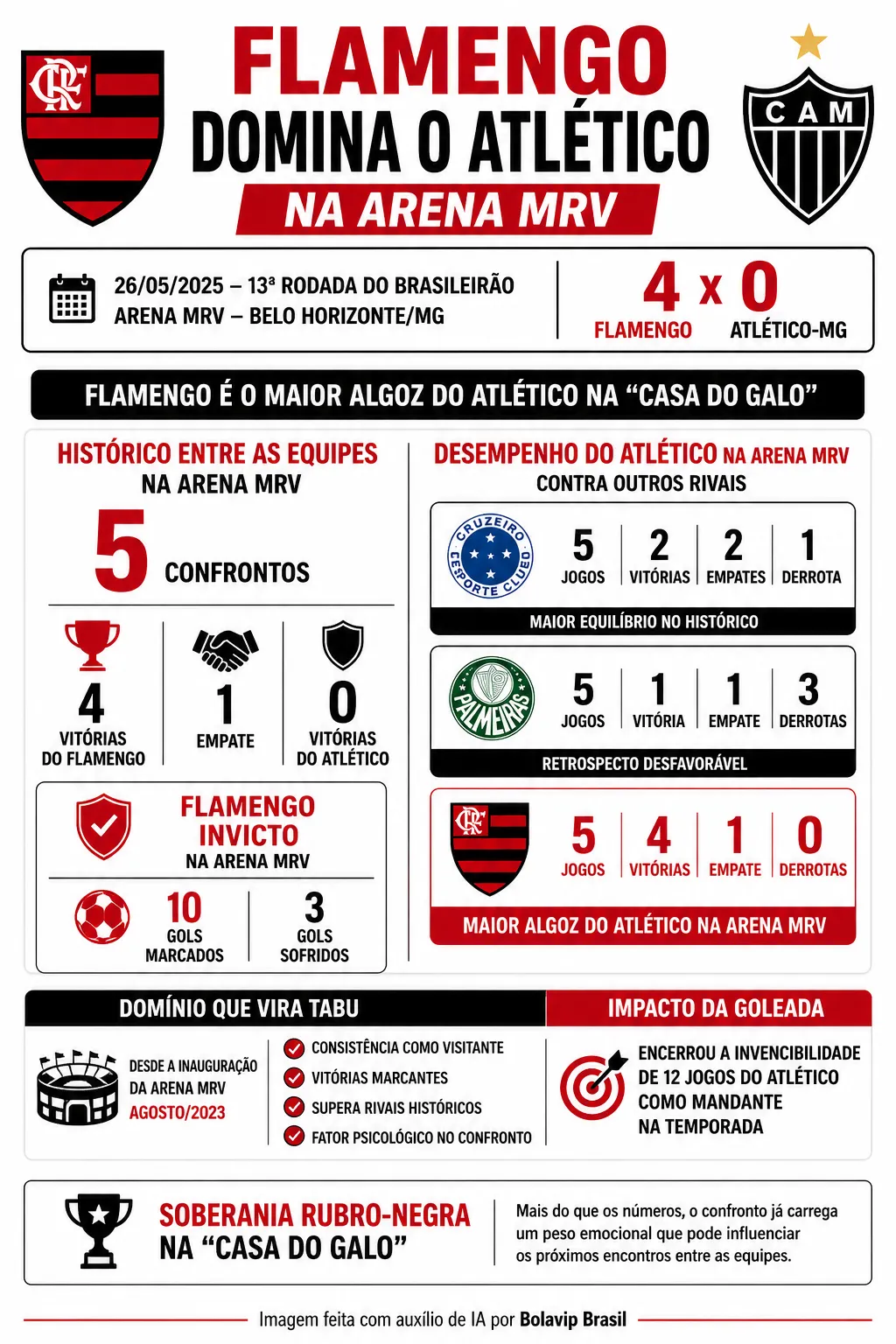 O Flamengo permanece invicto na Arena MRV. São cinco jogos, com quatro vitórias e um empate, além de 10 gols marcados e apenas três sofridos. A goleada mais recente ainda teve outro impacto relevante. O resultado encerrou a invencibilidade de 12 jogos do Atlético como mandante na temporada.