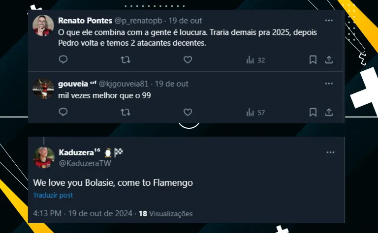 Posto isso, nos últimos dias surgiu a informação de que o atacante Yannick Bolasie teria entrado na mira de alguns clubes do Brasil, como Grêmio, Cruzeiro, Sport e Vitória. Assim, alguns flamenguistas comentaram sobre uma possível transferência ao Mengão e aprovaram o nome.