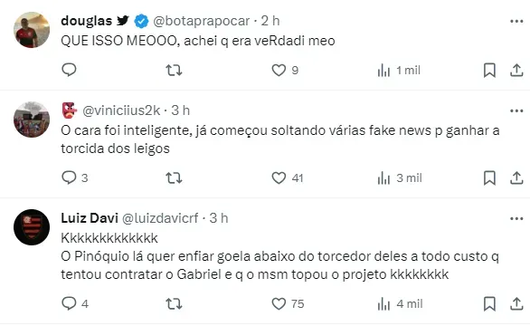 Desde sempre, deixamos claro que o Gabriel tem contrato com o Flamengo e um acordo verbal de renovação. Portanto, quando o presidente menciona que estava tudo certo com o agente do Gabriel, sinto a necessidade de esclarecer”, afirmou Júnior Pedroso.