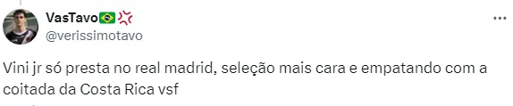Alguns torcedores criticaram a atuação de Vini Jr., ex-jogador do Flamengo, “Vini jr só presta no real madrid, seleção mais cara e empatando com a coitada da Costa Rica”.