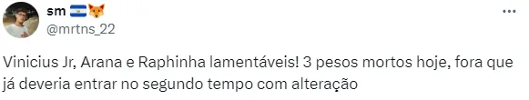 As criticas continuaram durante a partida: “Vinicius Jr, Arana e Raphinha lamentáveis! 3 pesos mortos hoje, fora que já deveria entrar no segundo tempo com alteração”.