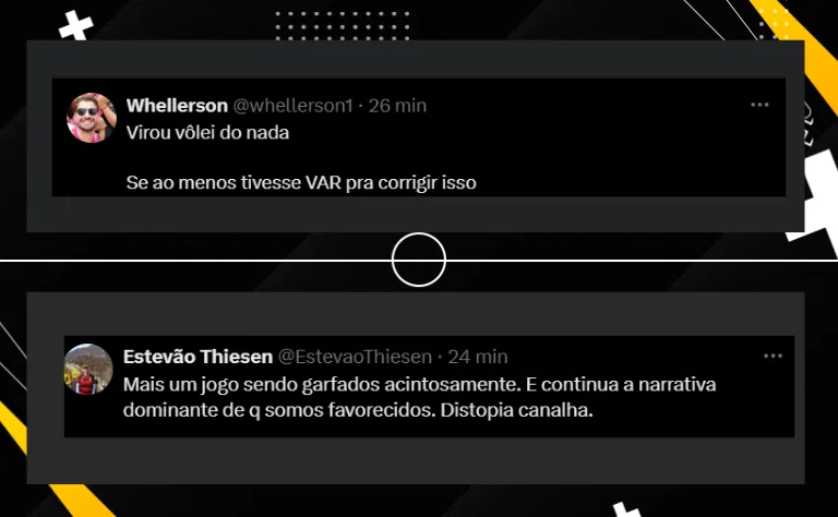 “Mais um jogo sendo garfados acintosamente. E continua a narrativa dominante de que somos favorecidos”, “É sempre assim” e “Virou vôlei do nada. Se ao menos tivesse VAR pra corrigir isso”, foram alguns comentários.
