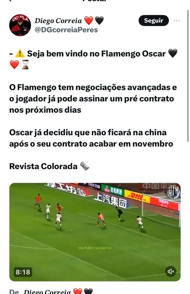 Segundo apurado pela Revista Colorada, o atleta e o Rubro-Negro avançaram nas tratativas e pode assinar um pré-contrato nos próximos dias. Oscar pertence ao Shanghai Port, time da China, mas já decidiu que não irá permanecer no clube após o final de seu vínculo, que vai até novembro.