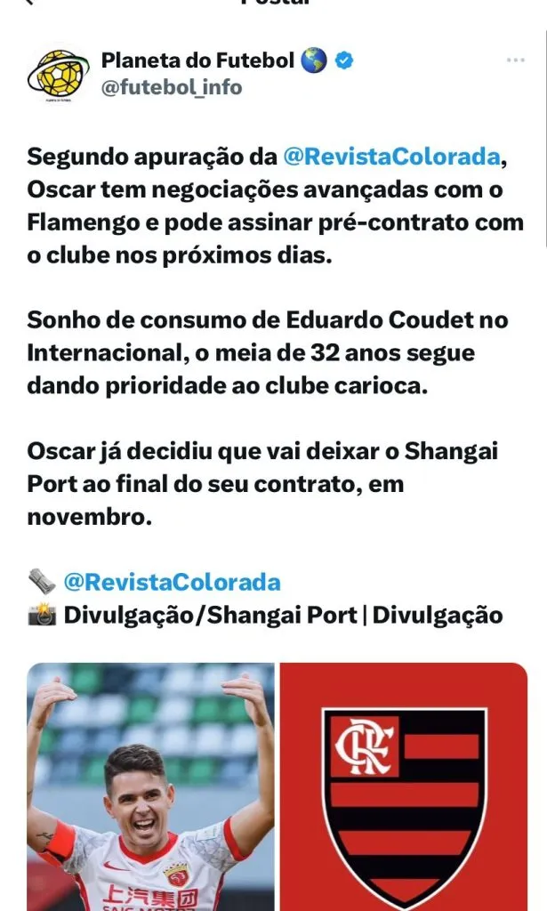 Anteriormente, o Bolavip Brasil também já havia noticiado que o Flamengo fecharia com Oscar para a disputa da Copa Libertadores. O valor seria em torno de R$ 1,5 milhão mensais.