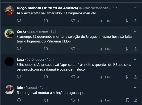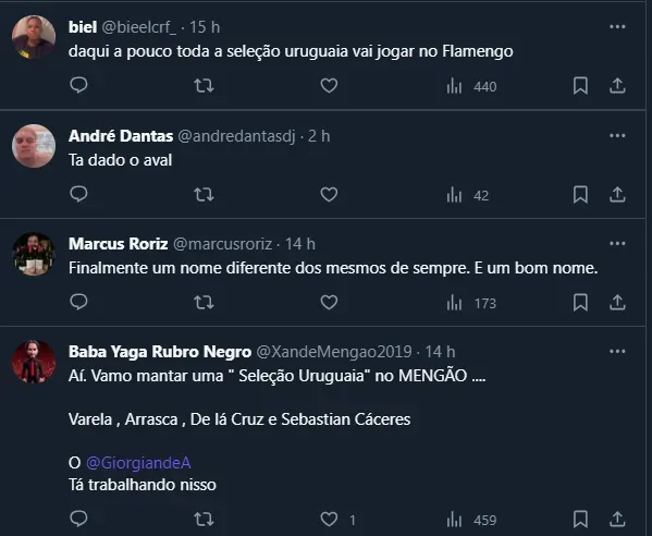Dessa maneira, por mais que a negociação seja complicada, o jogador chegaria com status de titular e com o aval da Nação Rubro-Negra. Aliás, vários flamenguistas brincaram com o fato de Cáceres ser uma contratação para agradar Arrascaeta, seu companheiro de Seleção do Uruguai.