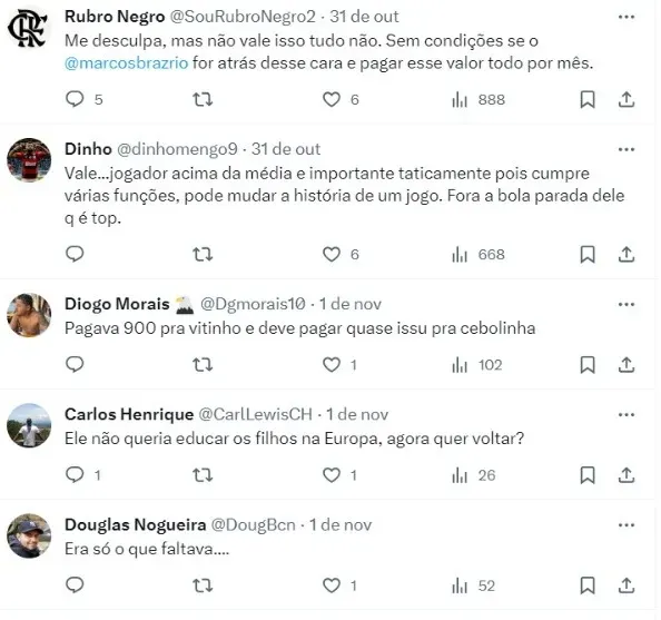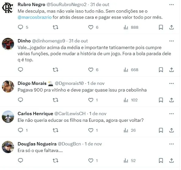 Em outras oportunidades, acabou ouvindo a mesma situação, mas acredita que os sucessos nas tratativas de Gabigol, Andreas Pereira, Ayrton Lucas entre outros, com um empréstimo com opção de compra, pode fazer com que consiga concluir um possível negócio nesses termos.