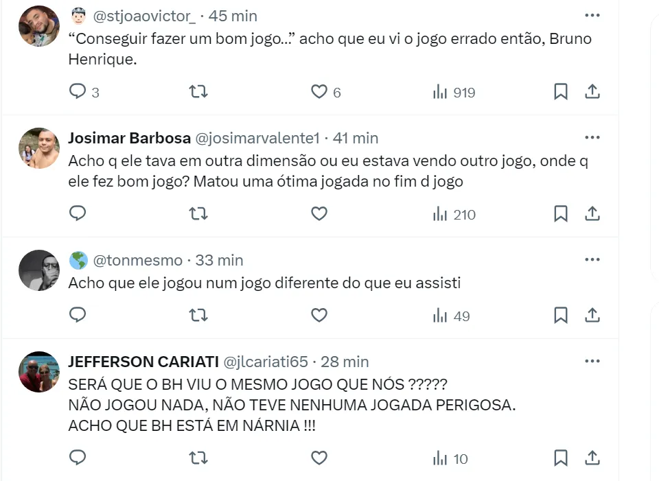 A entrevista de Bruno Henrique não agradou os flamenguistas. Os torcedores acreditam que a equipe da Gávea poderia ter sido mais ofensiva diante do Palmeiras e não gostaram da postura do time.