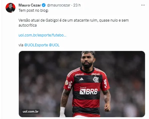 “Gabriel Barbosa caiu tanto de rendimento que chega a ser uma figura nula em campo. Como nos 27 minutos nos quais esteve no gramado sábado, diante do Corinthians. No 1 a 1 em Itaquera, o Flamengo piorou com sua entrada e a de Arrascaeta nos lugares de Pedro e Gerson. O uruguaio ainda tentou algumas jogadas, já o camisa 10? Gabi ficou por 27 minutos em campo, deu dois chutes sem perigo, um torto, para fora, outro bloqueado pela defesa do Corinthians. Algo próximo da nulidade”, opinou Mauro.