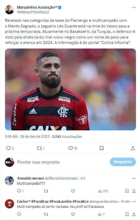 Trata-se de Léo Duarte, atualmente no Basaksehir, da Turquia, que foi criado nas categorias de base do Rubro-Negro. Importante destacar que o zagueiro de 27 anos tem contrato até junho de 2026 na Europa, mas pode receber oferta.