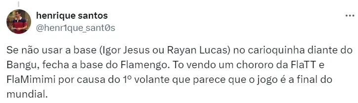 Ainda de acordo com o portal, o Flamengo deve ir à campo com a seguinte escalação: Rossi, Varela, Fabrício Bruno, Léo Pereira e Ayrton Lucas; Igor Jesus, Gerson e Arrascaeta; Luiz Araújo, Everton Cebolinha e Pedro.