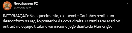 Em comunicado, através das redes sociais, relatou que o artilheiro não ia entrar em campo. “No aquecimento, o atacante Carlinhos sentiu um desconforto na região posterior da coxa direita. O camisa 19 Marllon entrará na equipe titular e vai iniciar o jogo diante do Flamengo”, relatou o perfil do Clube.