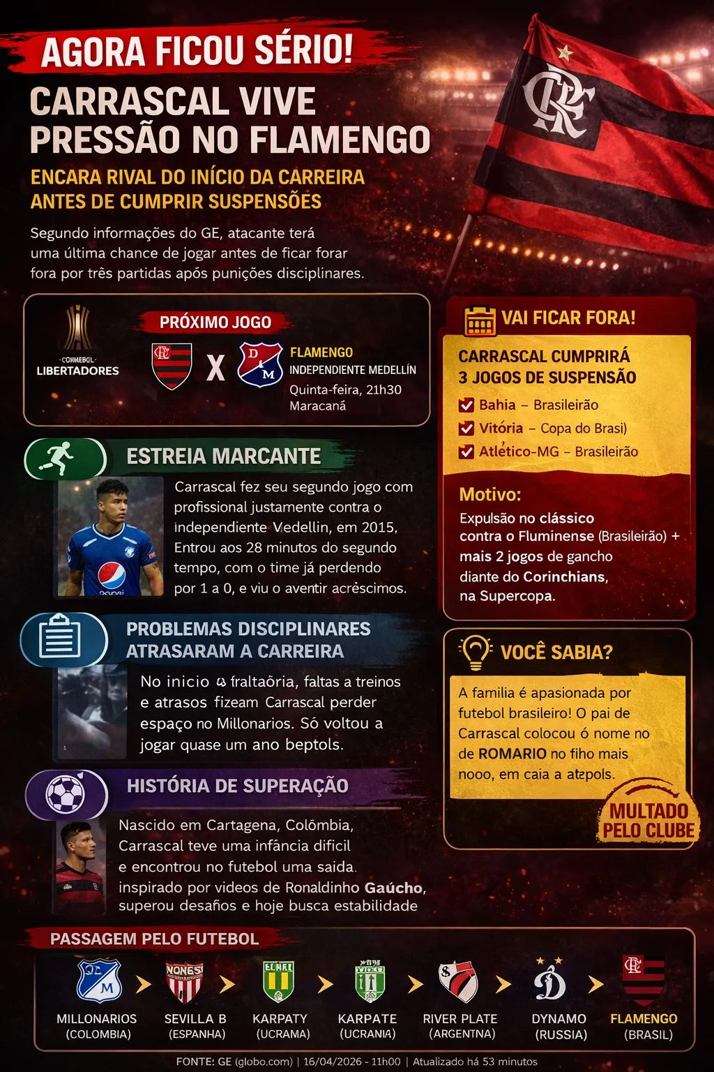 O Flamengo terá um desafio importante na Libertadores, mas também uma situação delicada envolvendo Carrascal. O atacante colombiano encara o Independiente Medellín nesta quinta-feira, no Maracanã, antes de cumprir uma sequência de suspensões que o afastará dos próximos jogos.