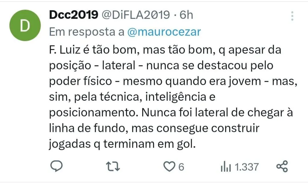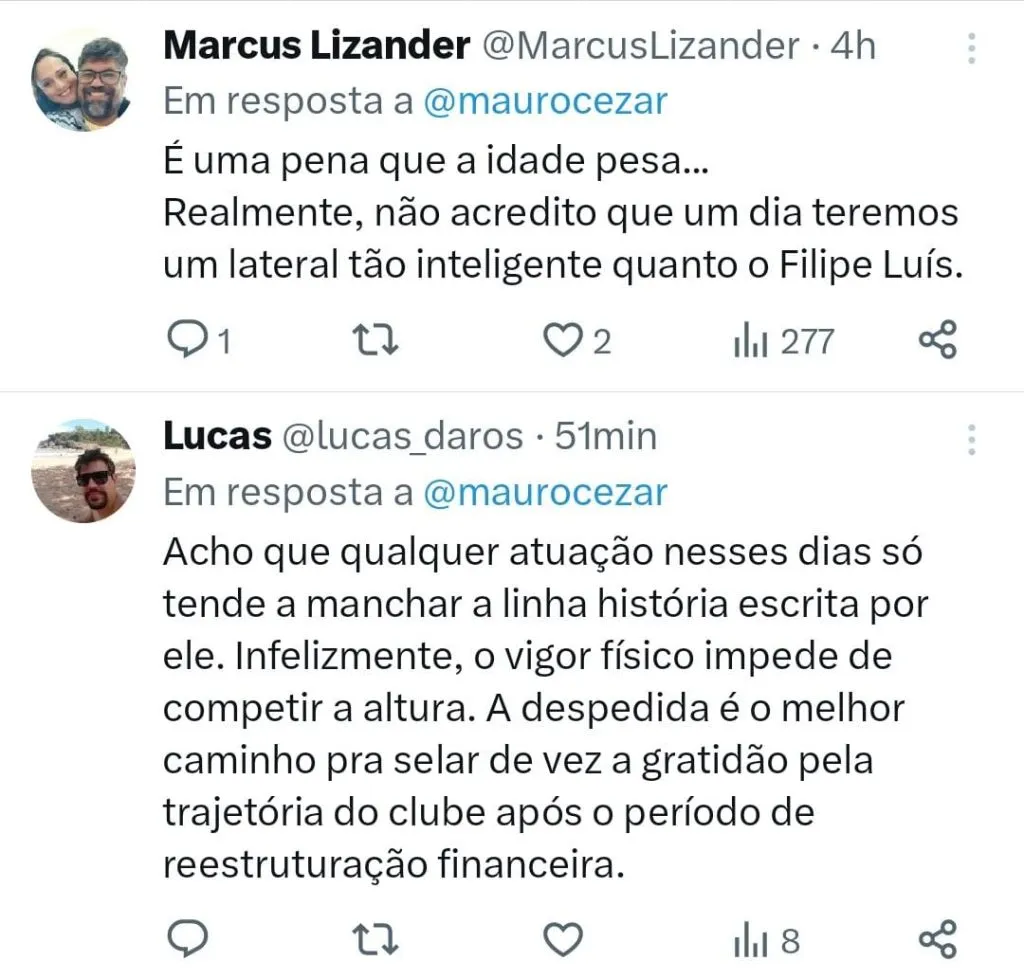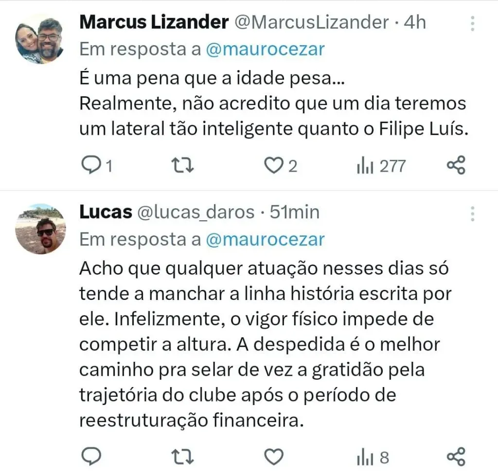 Quem também exaltou as qualidades de Filipe Luís foi o colunista Mauro Cezar, que também lamentou o fato de considerar que o jogador está na reta final de sua carreira. O jornalista usou as redes sociais para exaltar o lateral.