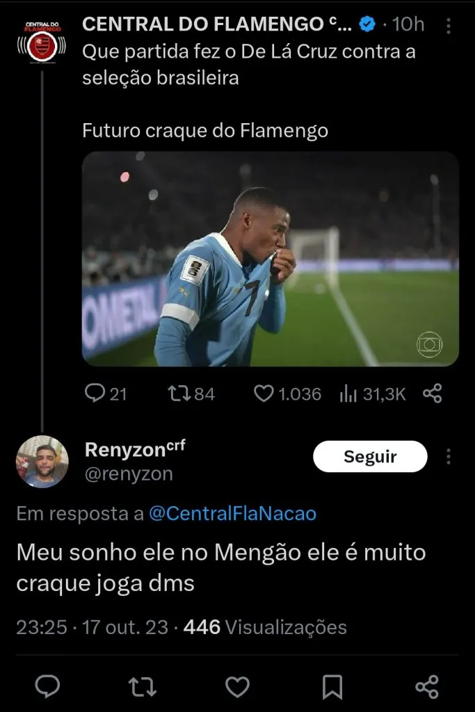 “Que partida fez o De La Cruz contra a seleção brasileira. Futuro craque do Flamengo”, exaltou o perfil Central do Flamengo (@centralFlaNacao). Um internauta completou assim: “Meu sonho ele no Mengão, ele é muito craque e joga demais”, escreveu o torcedor nas redes sociais. Vale lembrar que, na atual temporada, o jogador de 26 anos soma sete gols e três assistências em 32 partidas disputadas pelo River.