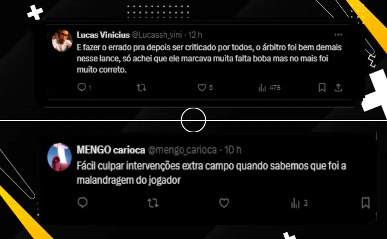 Também foi debatido a possibilidade de expulsão, o que foi descartado: “Não era oportunidade de gol, não era para vermelho. Tem o defensor aqui e outro jogador que poderia receber o passe também está marcado”.