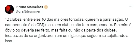 Por meio de um comunicado oficial, a Confederação Brasileira de Futebol relatou que recebeu o pedido das equipes, faz questão de deixar aberto ao diálogo com os clubes, mas definiu que no momento não é possível aderir à paralisação neste momento.
